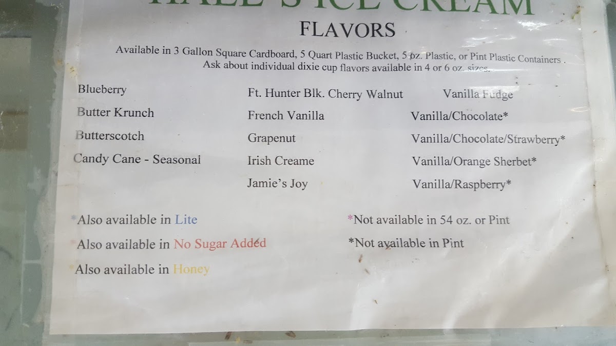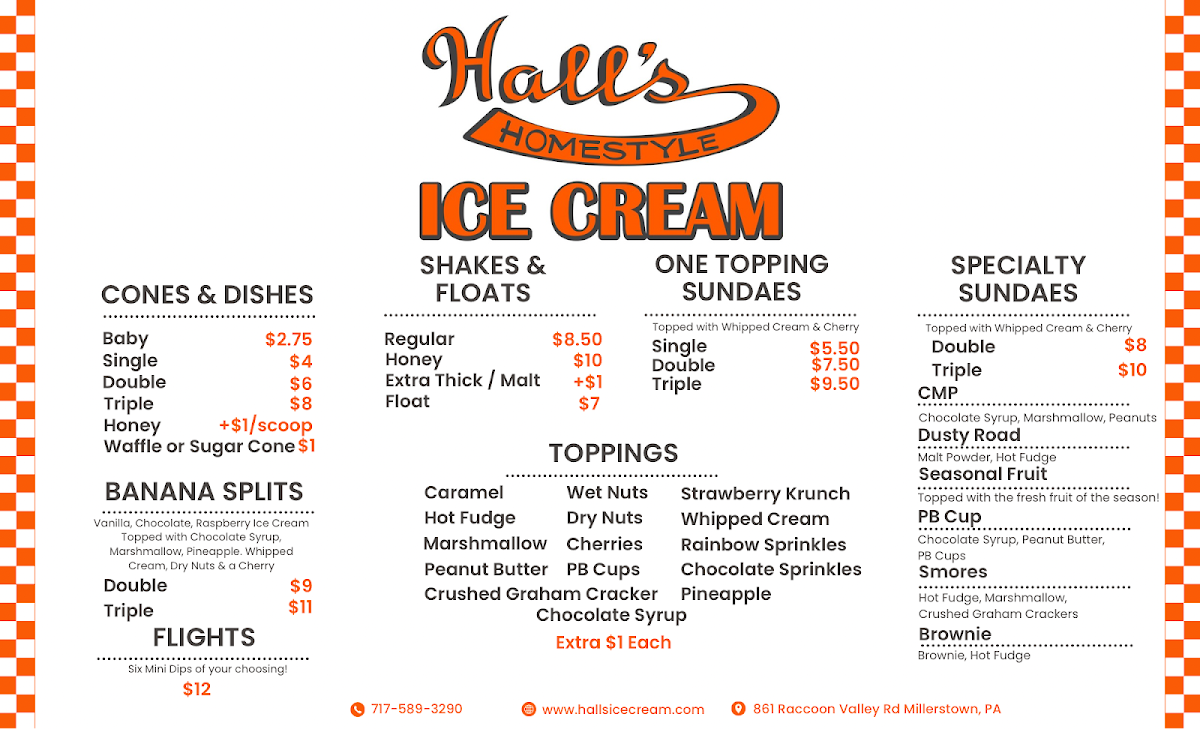 Overall, Hall’s Ice Cream delivers a classic, satisfying menu that leans into generous portions and nostalgic flavors, making it a standout stop for dessert lovers. The selection feels thoughtfully crafted to please both traditionalists and those looking for something indulgent, with sundaes and splits that truly highlight the richness of their ice cream. In particular, the Dusty Road Sundae stands out as a well-balanced treat, combining textures and flavors in a way that feels both comforting and memorable. Equally impressive is the Large Banana Split, which lives up to its name with its hearty size and abundance of toppings, perfect for sharing or for anyone ready to fully indulge. Taken together, the menu reflects a commitment to quality and classic ice cream shop charm, leaving a lasting impression that makes you want to return for another sweet experience.
